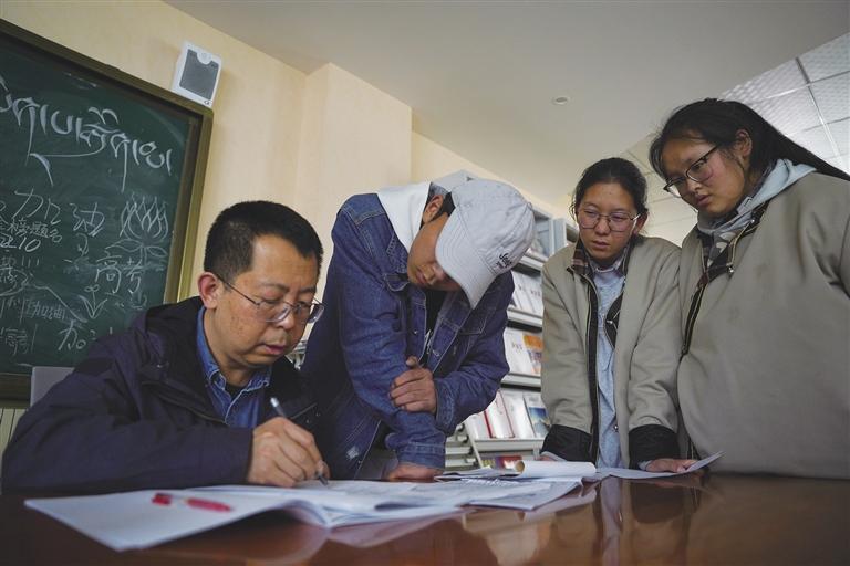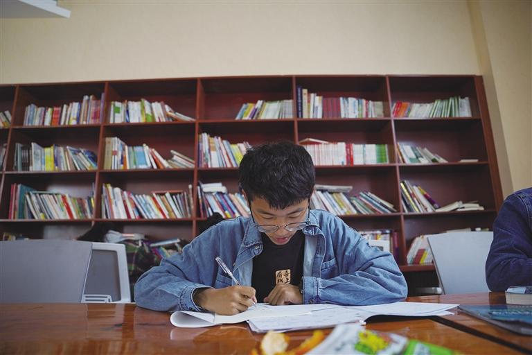 除了教室,閱覽室也是學習的好地方。在閱覽室,不少同學正奮筆疾書,只聽得見書頁翻動和筆尖書寫的“沙沙”聲。陽光透過玻璃傾瀉在書桌上,暖暖地照在這些青春的面龐,把他們點綴成五月里最美的風景。閱覽室的最里邊,一位老師正在認真講解試卷上的難題,不一會兒同學們就露出了恍然大悟的表情。“我很喜歡來閱覽室學習,這兒比教室更安靜些,可以讓我靜下心來做題?!睂W生扎西江村說。