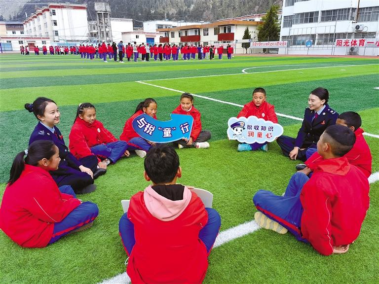 圖為林芝市稅務(wù)局青年黨員在波密縣完全小學(xué)開展稅法宣傳。記者 張猛 攝