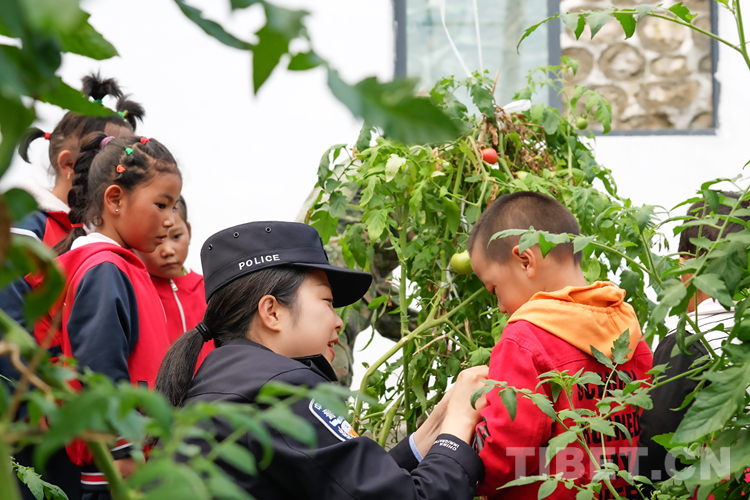 圖為亞東出入境邊防檢查站民警教龐達(dá)村雙語幼兒園小朋友分辨成熟的西紅柿