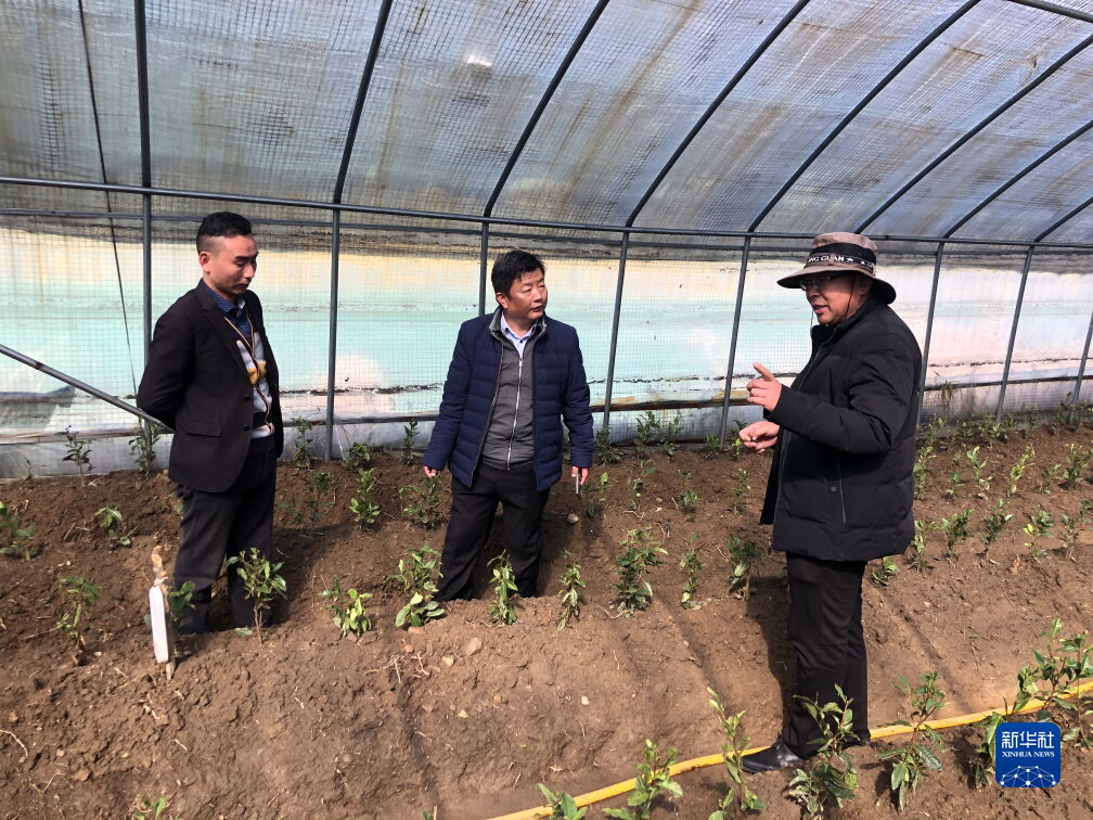 裴含龍(右二)在錯(cuò)那縣勒布溝貢日鄉(xiāng)指導(dǎo)大棚茶葉栽培。(受訪者供圖)