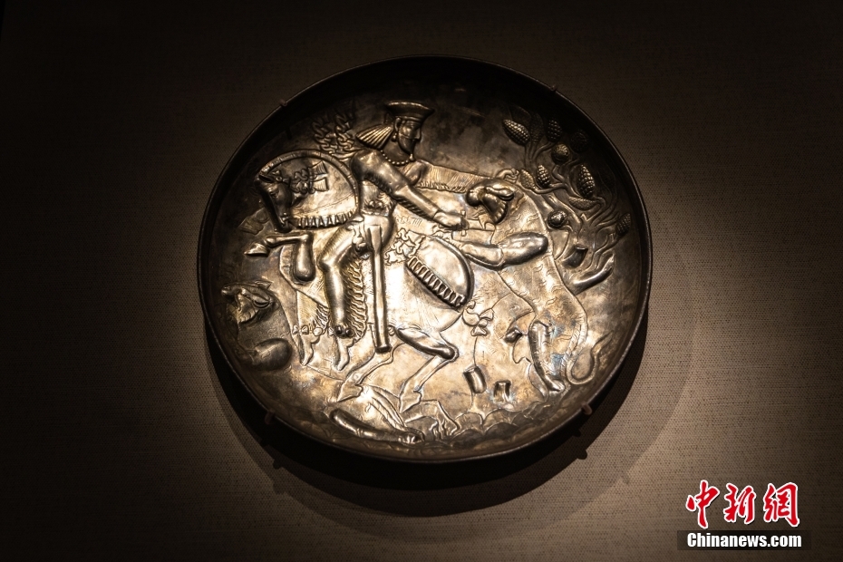 8月18日,甘肅省敦煌市,“燦爛記憶:從美索不達米亞到犍陀羅——東方文明古國冶金術(shù)展”在敦煌莫高窟揭幕。此次展覽是敦煌研究院與日本平山郁夫絲綢之路美術(shù)館近年第三次合作,展覽共展出從地中海沿岸,到中亞絲綢之路沿線國家的金屬類文物221組件、絲路錢幣33枚,時間跨度長達4000多年、范圍遍及歐亞大陸的絲綢之路上各大文明區(qū)域冶金術(shù)的變化圖景。圖為參展展品帝王狩獵紋盤。 中新社發(fā) 王嘉奇 攝