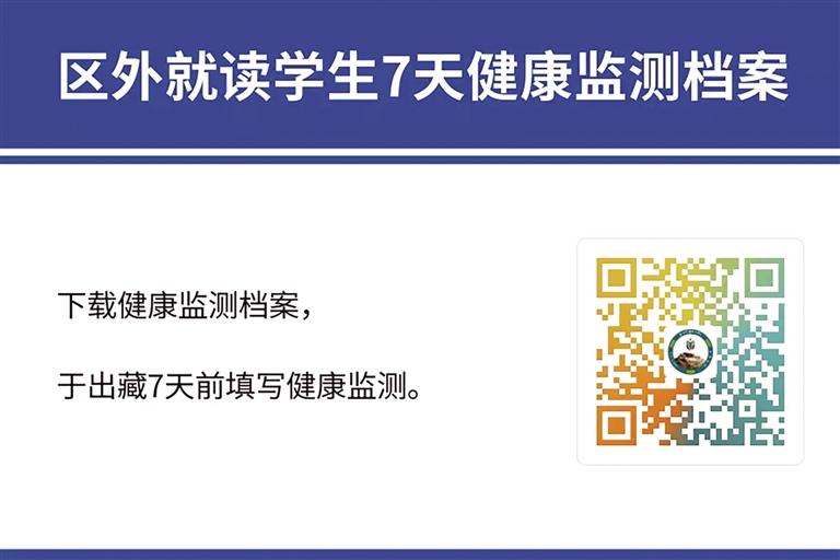 另外,居住在拉薩市的區(qū)外就讀西藏籍大學(xué)生、區(qū)外非西藏班就讀西藏干部職工子女、區(qū)外就讀進城務(wù)工人員子女、旅居區(qū)內(nèi)的區(qū)外學(xué)生出藏返校,須嚴(yán)格執(zhí)行《西藏自治區(qū)高風(fēng)險區(qū) 中風(fēng)險區(qū) 低風(fēng)險區(qū)疫情精準(zhǔn)防控辦法》,關(guān)于“高風(fēng)險區(qū)實行封控管理,原則上人員及車輛不進不出;中風(fēng)險區(qū)實行‘人不出區(qū)、嚴(yán)禁聚集’,原則上人員及車輛只進不出;低風(fēng)險區(qū)內(nèi)人員原則上非必要不離開本區(qū)域,如因就醫(yī)、特定公務(wù)等確需出入的,須持24小時內(nèi)核酸檢測陰性證明”要求。在此提醒廣大家長和學(xué)生,出藏返校須咨詢現(xiàn)居住地所在村(居)委會防疫要求,嚴(yán)格落實“三天兩檢”核酸檢測、藏易通綠碼等監(jiān)測程序,密切關(guān)注民航、鐵路等交通部門出行要求和目的地疫情防控政策,在滿足出藏防疫規(guī)定的前提下,進行出藏信息登記和“7天健康登記”(詳見文末二維碼),確定出藏行程。