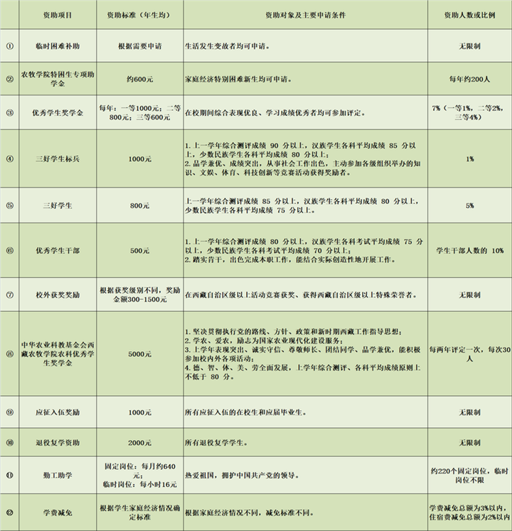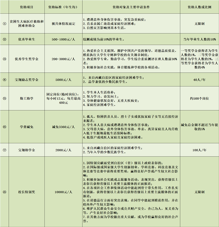 這些資助項目包括國家政策、西藏自治區(qū)政策和西藏各高校的政策,全部列出了明確的申請條件,涵蓋了學生生活、學習的方方面面。其中,有的項目針對家庭經(jīng)濟困難的學生給予學費、住宿費等的減免;有的項目為學生提供各種校內(nèi)勤工助學機會,讓學生通過勞動獲得報酬;有的項目獎勵入伍,有的項目獎勵發(fā)明創(chuàng)造……并且,西藏各高校在制定資助政策時體現(xiàn)出了各學校鮮明的辦學特點。例如,西藏藏醫(yī)藥大學設置了面向所有學生的“記誦《三部醫(yī)典》獎”,要求“熱愛社會主義祖國,擁護中國共產(chǎn)黨的領導;遵紀守法,遵守學校規(guī)章制度;背誦學生按‘三部醫(yī)典’章節(jié)順序依次背誦。在背誦過程中,要吐字清晰,聲音宏亮,總時間不能超過2個小時。”凡是達到要求的學生,獎勵1800元。