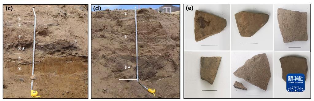 圖(c)(d)分別為共塘遺址調(diào)查剖面1和剖面2地層(三角形表示陶片位置)。圖(e)為本研究所分析的陶片照片。(資料圖片由第二次青藏科考隊“人類活動歷史及其影響”分隊提供)