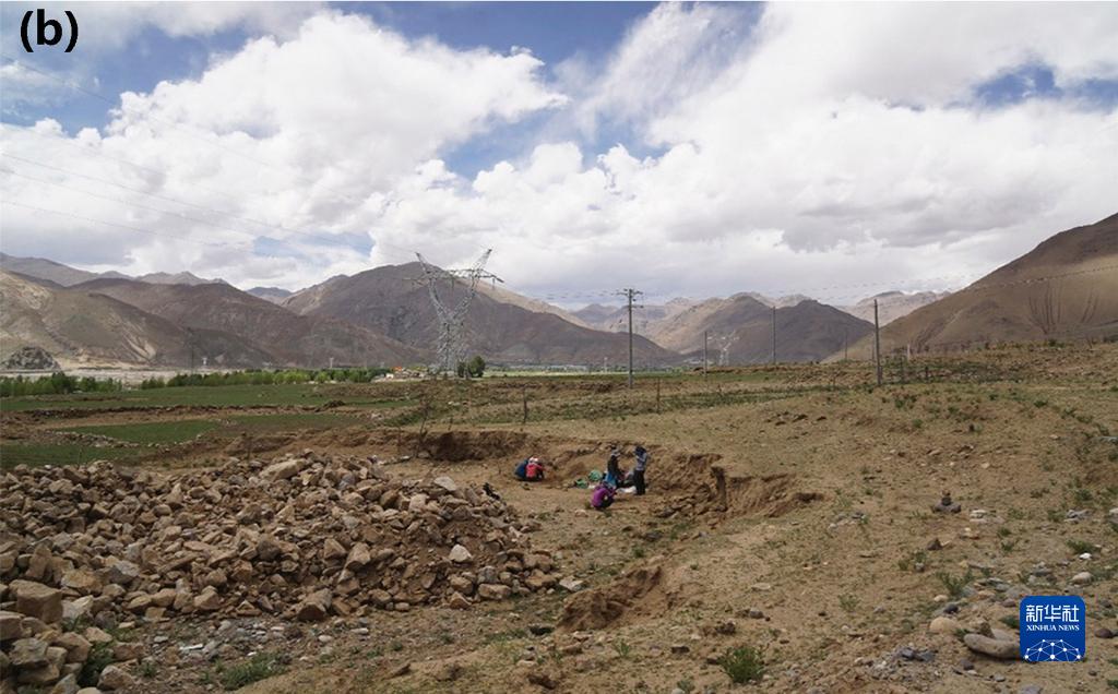 圖(b)為科考隊員發(fā)現(xiàn)共塘遺址后隨即進(jìn)行地層剖面清理和樣品采集。(資料圖片由第二次青藏科考隊“人類活動歷史及其影響”分隊提供)
