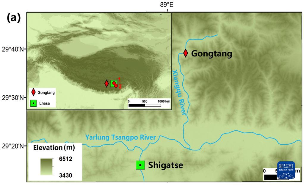 圖(a)為雅魯藏布江中游部分地區(qū)遺址背景資料圖,曲貢(1)、邦嘎(2)和共塘遺址位置(紅色菱形所示)。(資料圖片由第二次青藏科考隊“人類活動歷史及其影響”分隊提供)