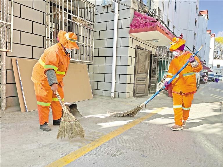 薩市城關(guān)區(qū)女環(huán)衛(wèi)工人在清掃地面。記者 旦增蘭澤 攝