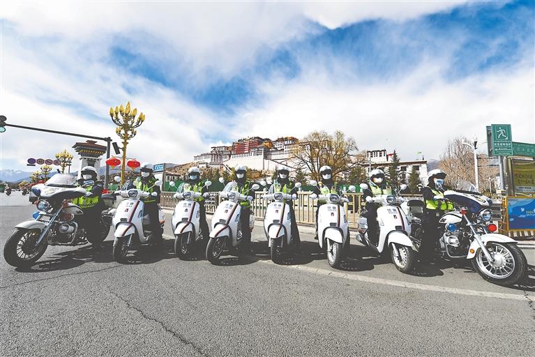 拉薩市公安局交警支隊(duì)城北大隊(duì)女子中隊(duì)的交警正在巡邏。記者 唐斌 攝