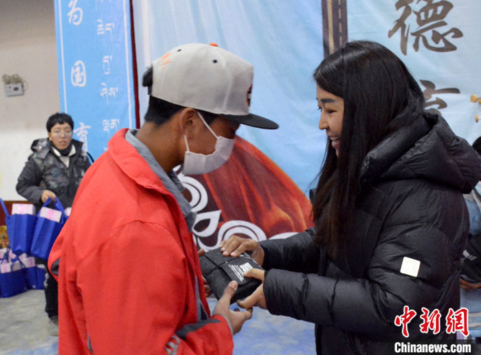 2021年,西藏那曲公益捐贈活動中,德慶玉珍(右)為青少年兒童送上成長愛心包。(資料圖片) 受訪者 供圖