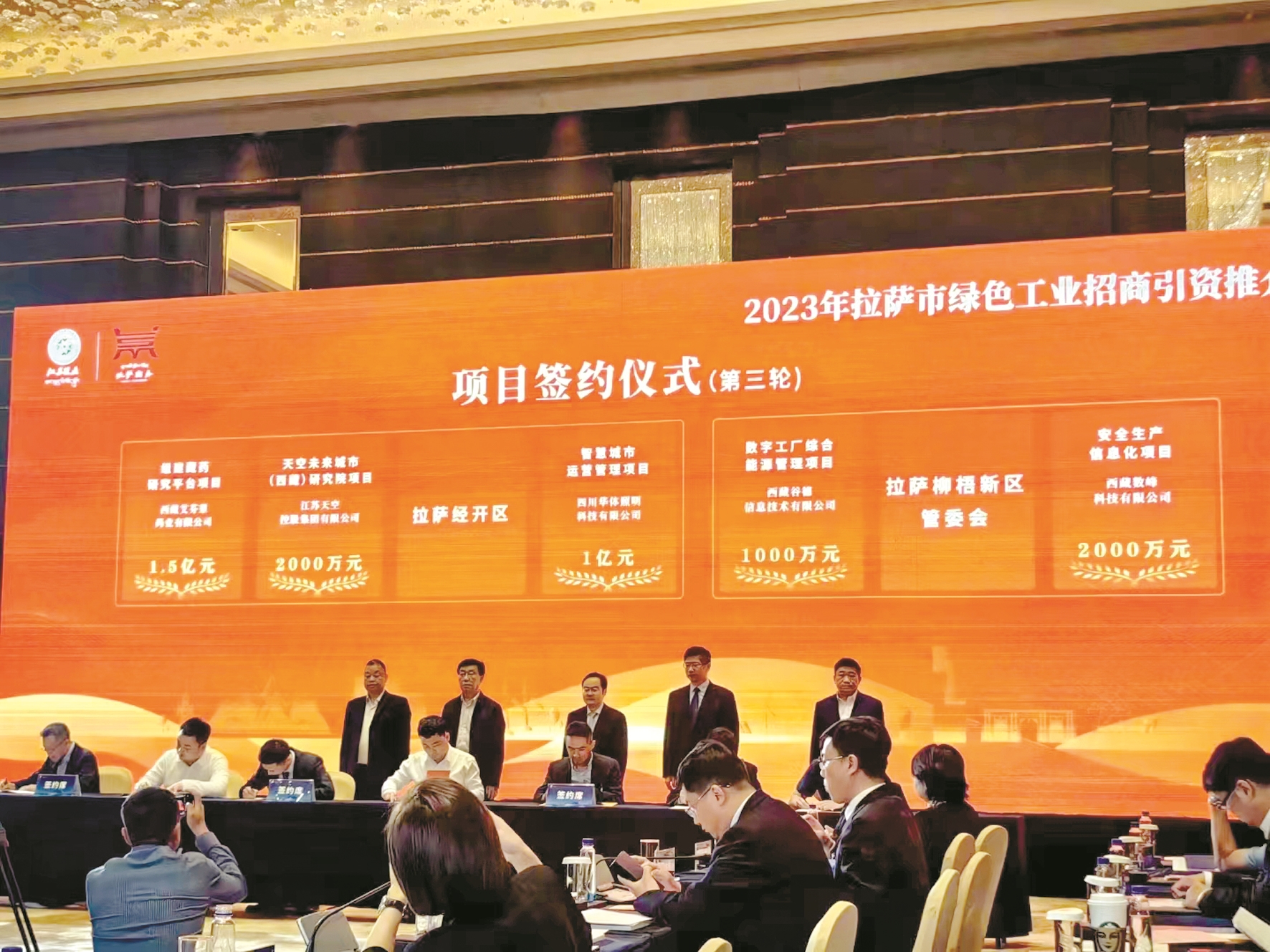 4月17日,2023年拉薩市綠色工業(yè)招商引資推介會(huì)暨項(xiàng)目簽約儀式在南京舉行,活動(dòng)由拉薩市人民政府、西藏自治區(qū)招商局、江蘇援藏前方指揮部主辦,拉薩市商務(wù)局、拉薩經(jīng)濟(jì)技術(shù)開發(fā)區(qū)聯(lián)合承辦。江蘇省商務(wù)廳副廳長倪海清、江蘇省工業(yè)和信息化廳二級巡視員宋旭東、西藏自治區(qū)招商局副局長次旦格來應(yīng)邀出席活動(dòng)并致辭,簽約企業(yè)代表、拉薩市各縣(區(qū))、經(jīng)濟(jì)功能園區(qū)分管招商工作負(fù)責(zé)人以及知名企業(yè)代表近140余人參加推介會(huì)。本次推介會(huì)共簽約項(xiàng)目15個(gè),協(xié)議投資達(dá)32.3億元。