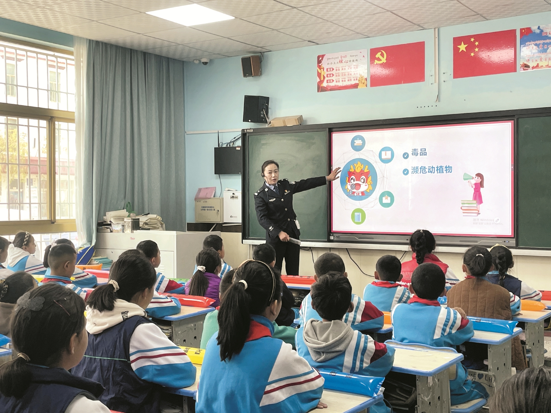 操場上,民警們引導(dǎo)學(xué)生觀看保護(hù)瀕危動物宣傳展板,講解動物與人類的親密關(guān)系,學(xué)生們提出的問題,民警都耐心地給他們一一解答?!皵?shù)數(shù)瀕危動物有哪些”的互動游戲吸引了不少學(xué)生參與?!敖裉炀焓迨鍋淼轿覀儗W(xué)校,給我們講了關(guān)于毒品的一些知識,還認(rèn)識到很多保護(hù)動物,我覺得這次活動很有意義?!焙5硇W(xué)四年級三班格桑拉姆說。