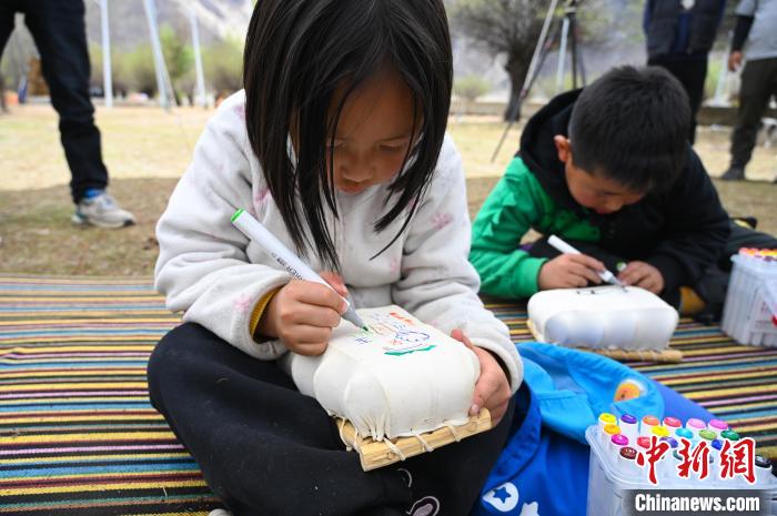 圖為兒童體驗羊皮筏彩繪?!≮w朗 攝