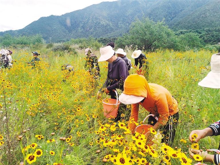 圖為巴宜區(qū)人社局聯(lián)合林芝林卡旅游開發(fā)有限公司開展“以工代訓”,組織農(nóng)牧民群眾在布久鄉(xiāng)工布原鄉(xiāng)景區(qū)采收雪菊。通訊員 楊健 記者 謝筱純 王珊 攝