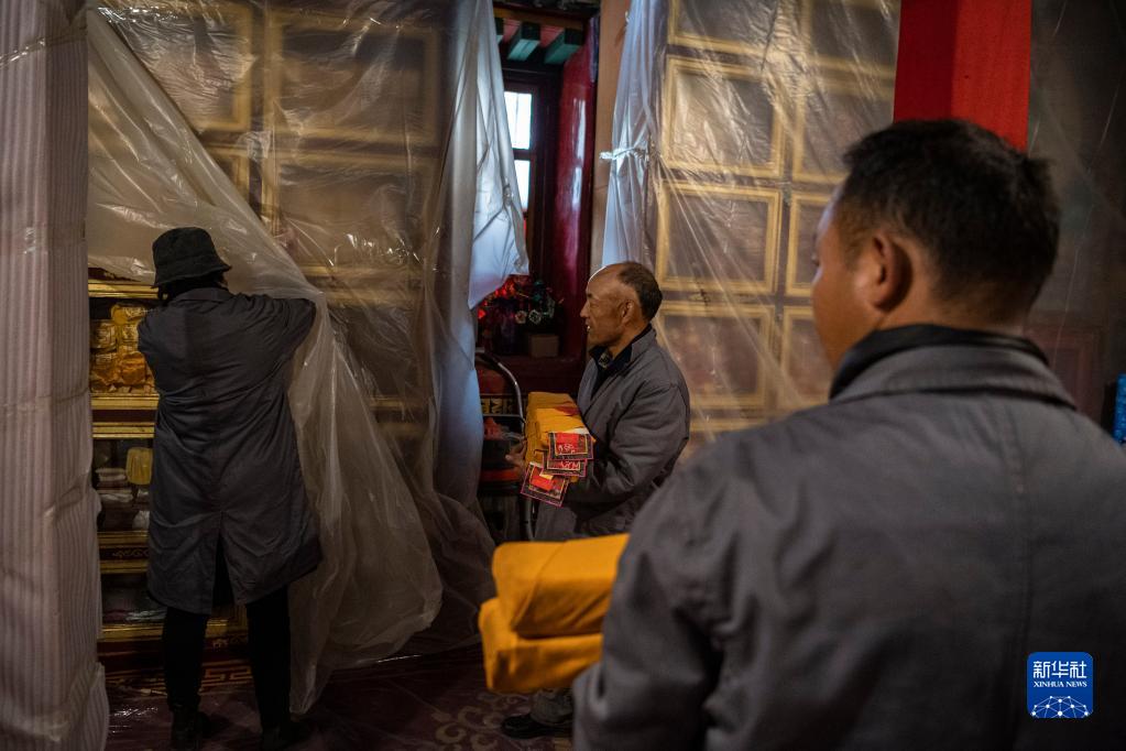 久米次成(左)與同事搬運準(zhǔn)備進(jìn)行普查登記的古籍(4月19日攝)。新華社記者 晉美多吉 攝
