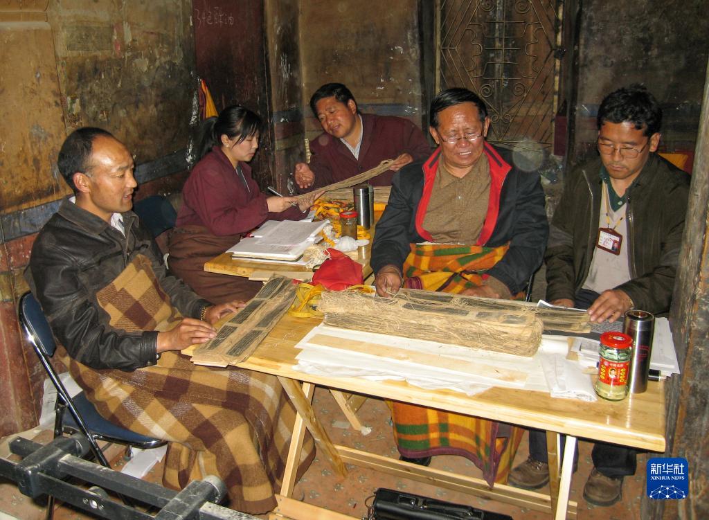 久米次成(左一)在布達(dá)拉宮整理館藏貝葉經(jīng)(2008年5月12日攝)。新華社發(fā)