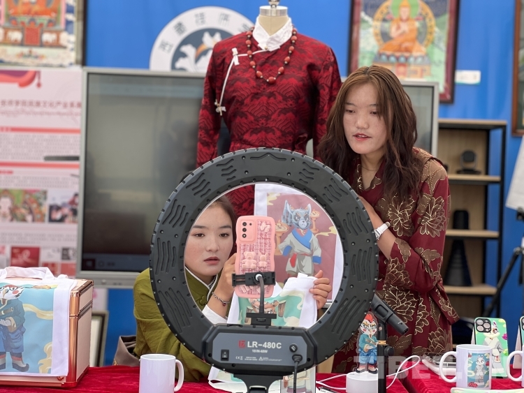 在展示交流區(qū),兩名穿著藏裝的姑娘正在通過直播向觀眾介紹有十二生肖圖案的被子、手機(jī)殼、筆記本等各類產(chǎn)品,也吸引著現(xiàn)場嘉賓前來參觀?!斑@些作品是民族文化產(chǎn)業(yè)系學(xué)生的作品,圖案都是學(xué)生自己繪畫的原創(chuàng)文創(chuàng)產(chǎn)品。”西藏技師學(xué)院數(shù)字信息產(chǎn)業(yè)系教師桑珍介紹,“兩位姑娘是21級電商專業(yè)學(xué)生,通過這次活動一方面希望自己得到鍛煉,另一方面也是為7月份的電商大賽做前期的培訓(xùn)?!?/p>