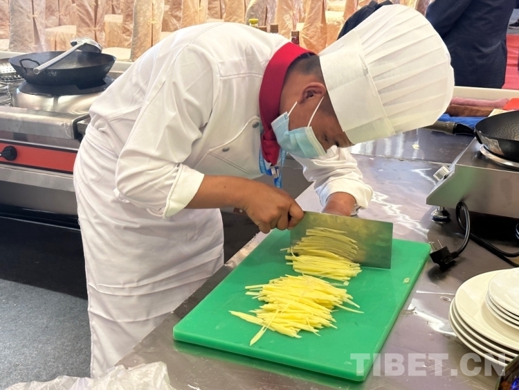 圖為來自阿里地區(qū)中等職業(yè)技術(shù)學校的參賽選手桑杰元旦在切土豆絲 攝影:旦曲