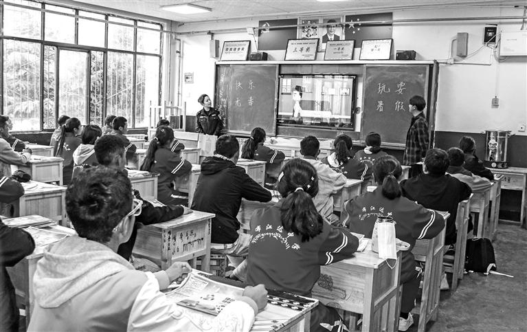 工布江達(dá)縣公安局禁毒大隊(duì)民警與拉薩市職業(yè)技術(shù)學(xué)院志愿者在縣中學(xué)向?qū)W生播放禁毒宣傳片。記者 彭琦 實(shí)習(xí)生 旦增旺姆 攝