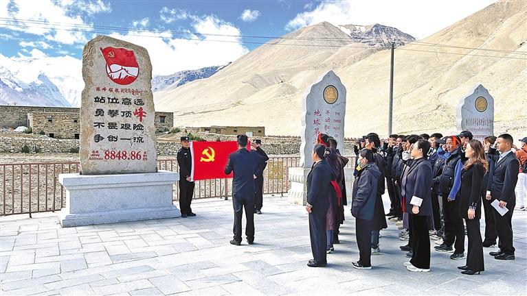 圖為聯(lián)創(chuàng)共建活動中,20余名黨員在“珠峰領航”石碑前重溫入黨誓詞。記者 索朗瓊珠 攝