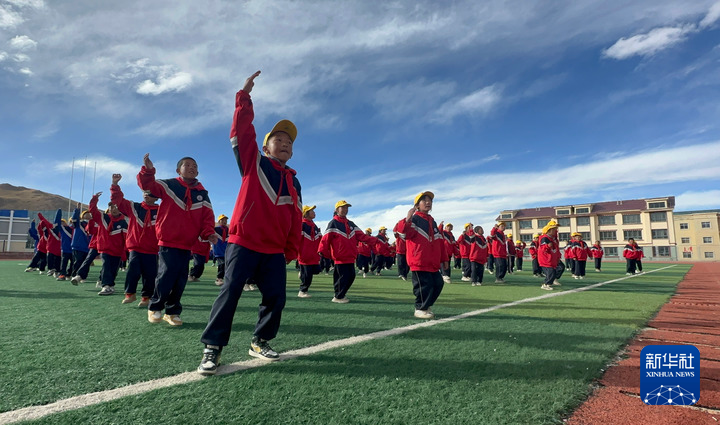 10月13日,在西藏那曲市班戈縣中石化小學,學生跟隨老師在操場上做運動。新華社發(fā)(孔琳琳 攝)