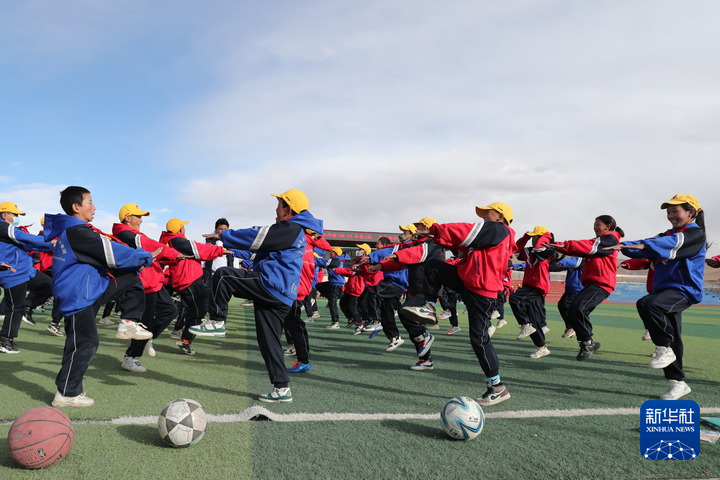 10月13日,在西藏那曲市班戈縣中石化小學,學生在操場上做運動。新華社發(fā)(王敬 攝)