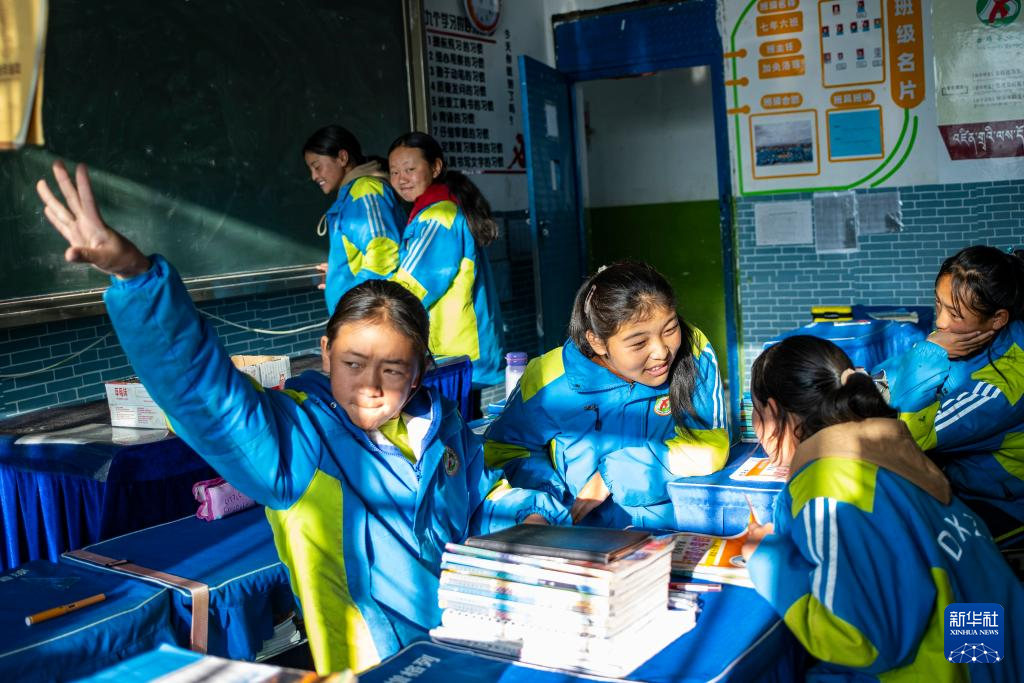 斯曲卓瑪(右三)和同學(xué)在課間休息(11月10日攝)。新華社記者 孫非 攝