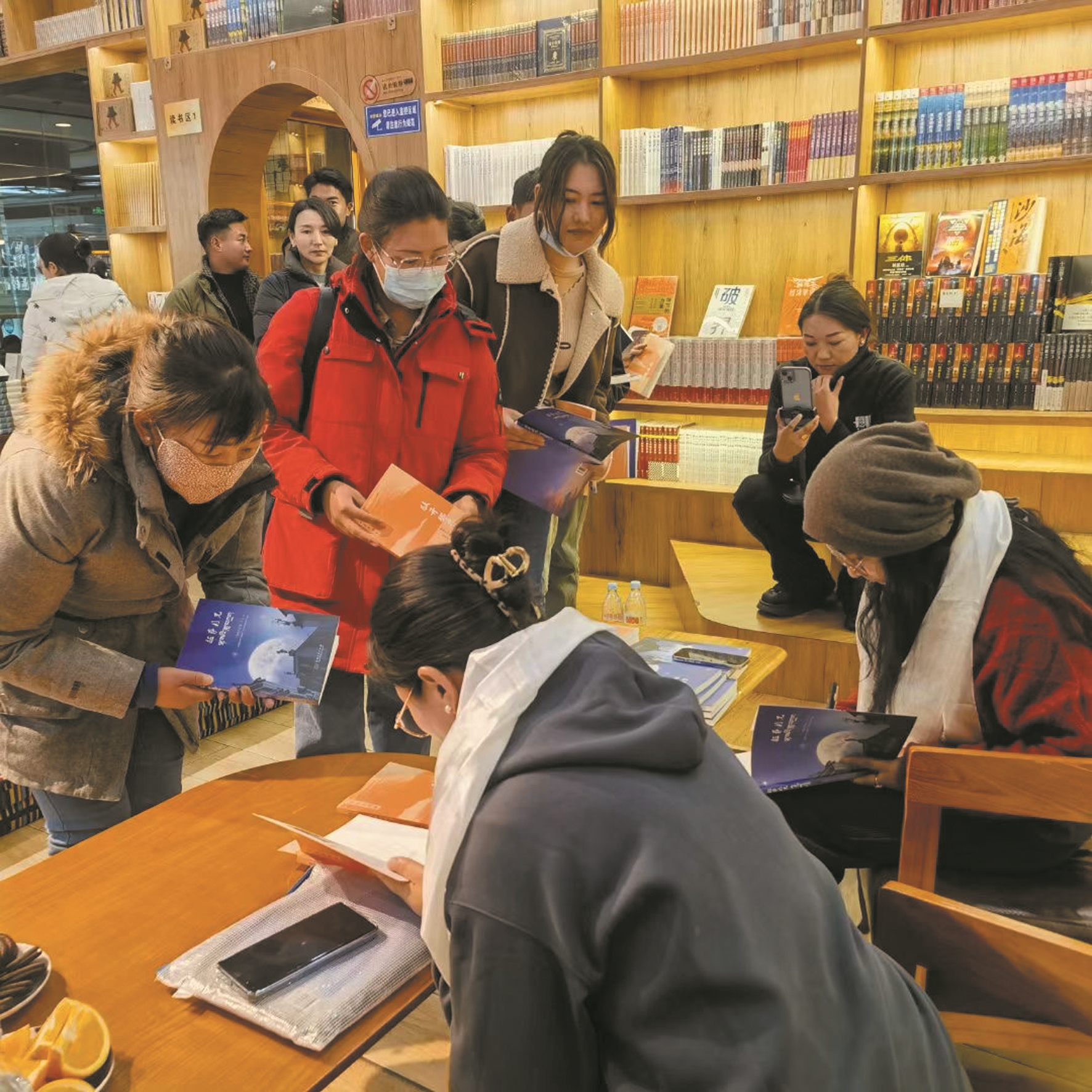 圖為在讀書分享交流會現(xiàn)場,作家納穆卓瑪與達娃央金在為讀者簽名。 拉薩融媒記者 滿文妍攝