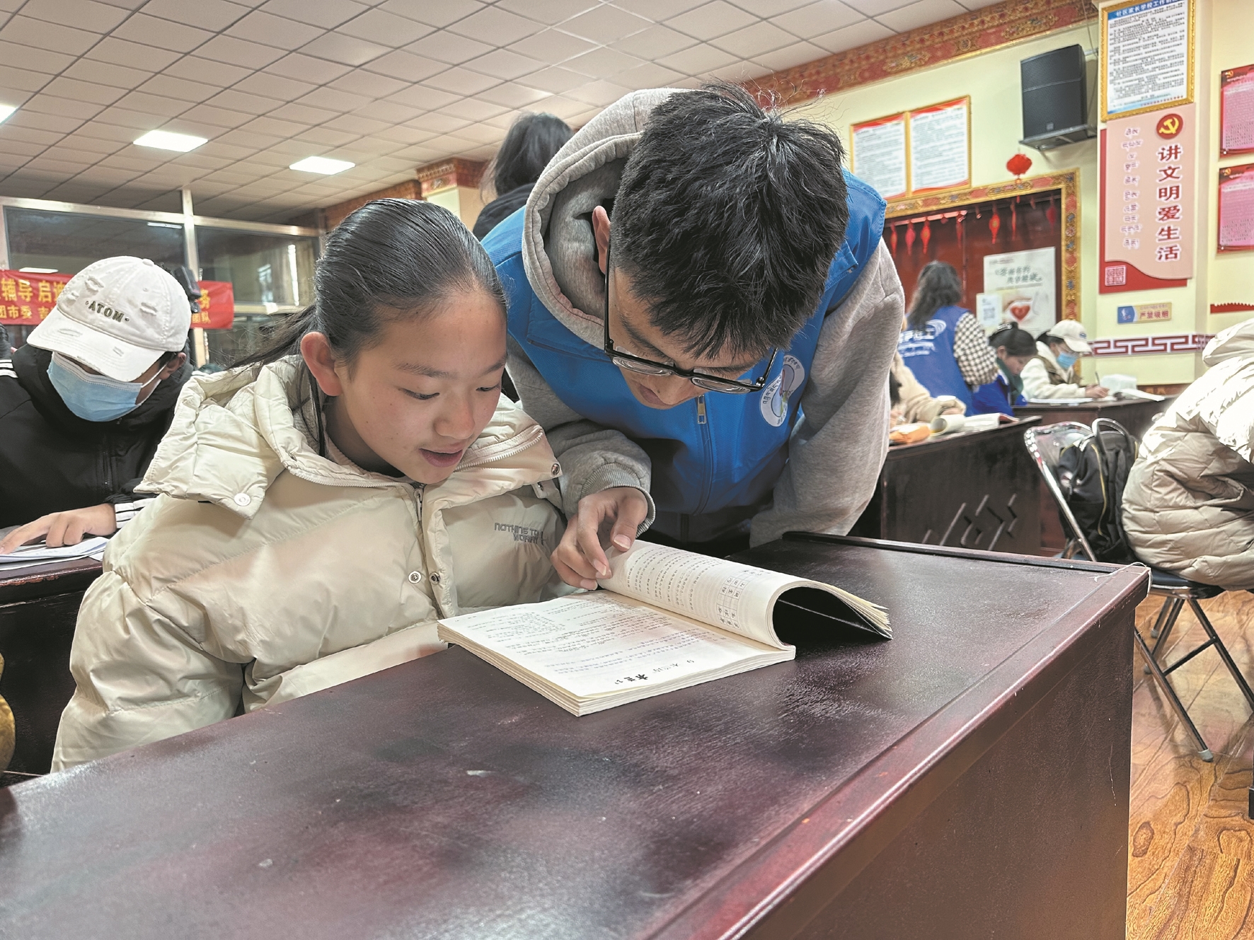 寒假期間,不少家長因為沒辦法輔導(dǎo)孩子的日常學(xué)習(xí)而感到苦惱。前不久,吉崩崗街道聯(lián)合市團(tuán)委、摯善公益團(tuán)隊在熱木其社區(qū)居委會里設(shè)立了一個臨時“教室”,為轄區(qū)孩子們提供為期一個月的課業(yè)輔導(dǎo)志愿服務(wù)。現(xiàn)場,返鄉(xiāng)大學(xué)生志愿者們變身為一名名“小老師”,耐心幫助孩子們解決學(xué)習(xí)難題,輔導(dǎo)的課業(yè)涵蓋了小學(xué)、初中的所有科目。除了教作業(yè),志愿者還組織孩子們開展演講比賽、書法比賽等活動,充實了孩子們的假期生活。
