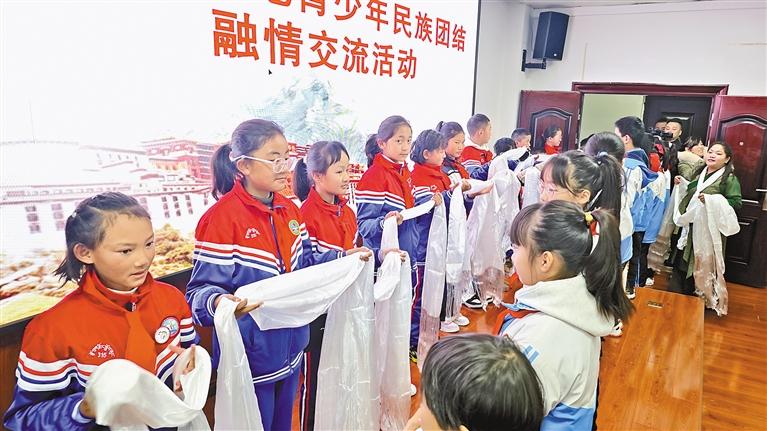 圖為洛扎縣的同學(xué)們向華夏方圓學(xué)校學(xué)生敬獻(xiàn)哈達(dá)。記者 武沛濤 攝
