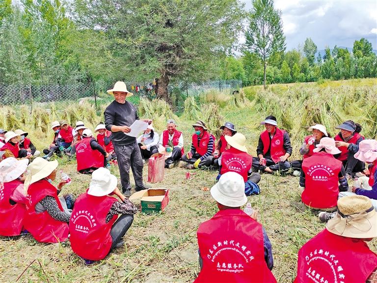 圖為乃東區(qū)新時(shí)代文明實(shí)踐志愿服務(wù)隊(duì)在田間地頭學(xué)習(xí)強(qiáng)農(nóng)惠農(nóng)政策。記者 劉楓 攝