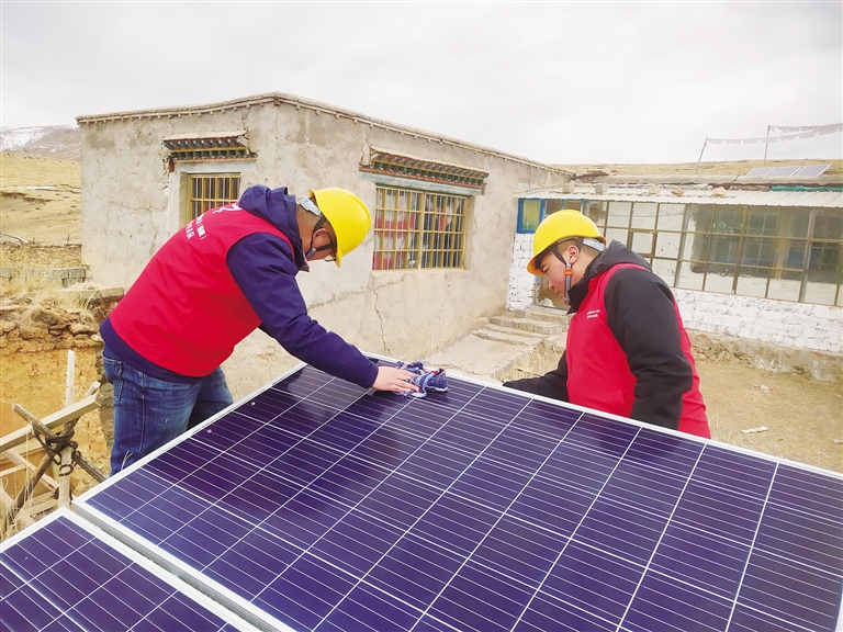 “次桑在家嗎?我們過(guò)來(lái)看一下你們新年準(zhǔn)備得怎么樣了?”聽(tīng)到劉光輝的呼喚,孩子們都跑出來(lái)迎接這位“小黃帽”叔叔。劉光輝和羅桑歐珠進(jìn)屋放下年貨,顧不上休息,立馬搭梯子爬上次桑家的房頂,用抹布拂去光伏電板上的塵土,拿出工具仔細(xì)檢查電源和光伏設(shè)備是否有損壞?!按紊<矣玫氖俏覀兊牡谝淮?yáng)能光伏電板,這個(gè)電板要經(jīng)常擦拭,保持表面干凈,發(fā)電效率會(huì)更好?!眲⒐廨x說(shuō)。檢修完光伏電板后,劉光輝和羅桑歐珠又回到屋內(nèi)檢查次桑家的電路線(xiàn)路,對(duì)插排插座等可能存在安全隱患的地方進(jìn)行認(rèn)真排查。確保沒(méi)有問(wèn)題后,兩人將之前昏暗的燈泡全部換成了最新的節(jié)能燈泡,整個(gè)屋子一下亮堂了起來(lái)。