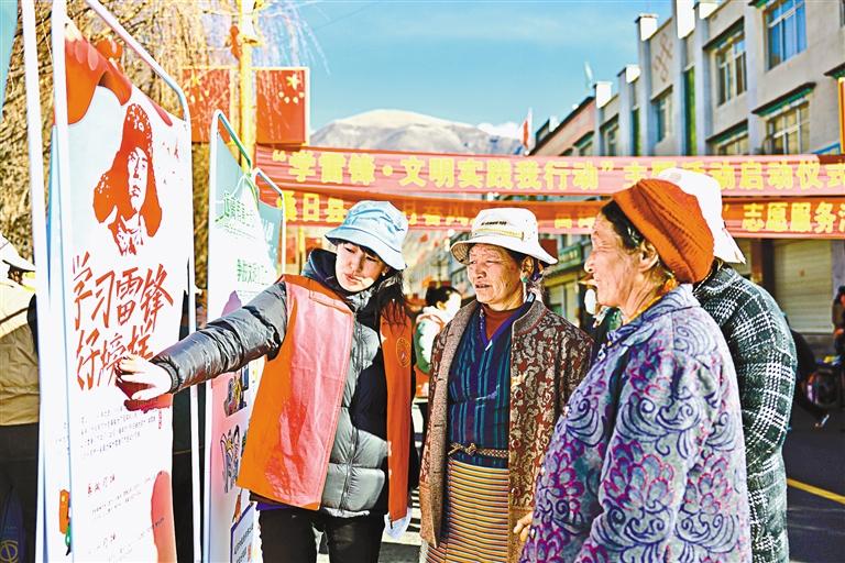 圖為在桑日縣“學(xué)雷鋒·文明實(shí)踐我行動(dòng)”主題活動(dòng)啟動(dòng)儀式現(xiàn)場(chǎng),志愿者向過(guò)往群眾講解雷鋒精神。記者 丹增平措 攝