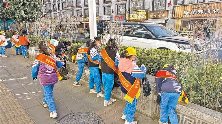 圖為拉薩市第一小學小小志愿者們沿街清掃。記者 格桑倫珠 攝