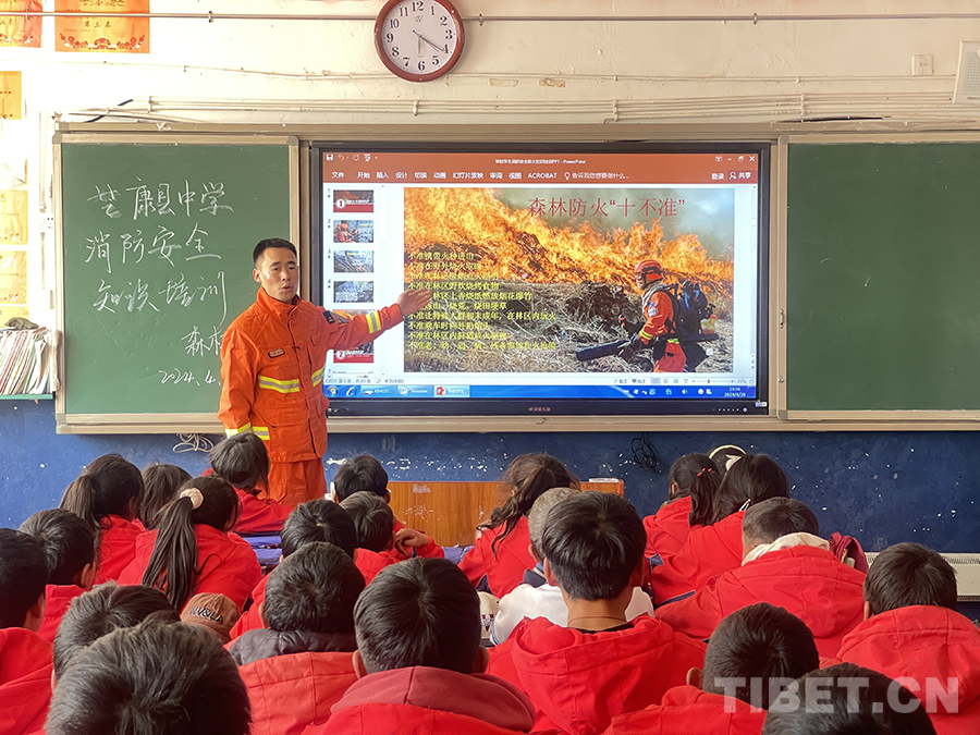 在芒康縣中學授課現(xiàn)場,芒康縣森林消防分隊負責人夏能向全校師生講解森林防火的重要意義、火災的起因、相關法律法規(guī)和常用防火知識等,教育引導同學們樹立森林防火意識,做到不帶火種進山,發(fā)現(xiàn)火情及時報警。