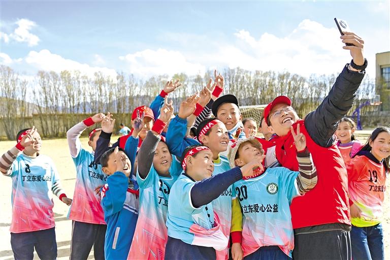圖為丁立東愛心救助網(wǎng)志愿者與芒熱鄉(xiāng)中心小學學生合影。記者 扎西頓珠 攝
