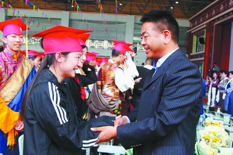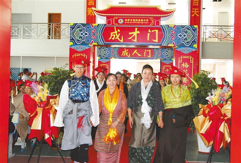 圖為老師和父母牽著孩子們的手一同走過(guò)成人門(mén)、成才門(mén)、成功門(mén)。記者 央金 攝