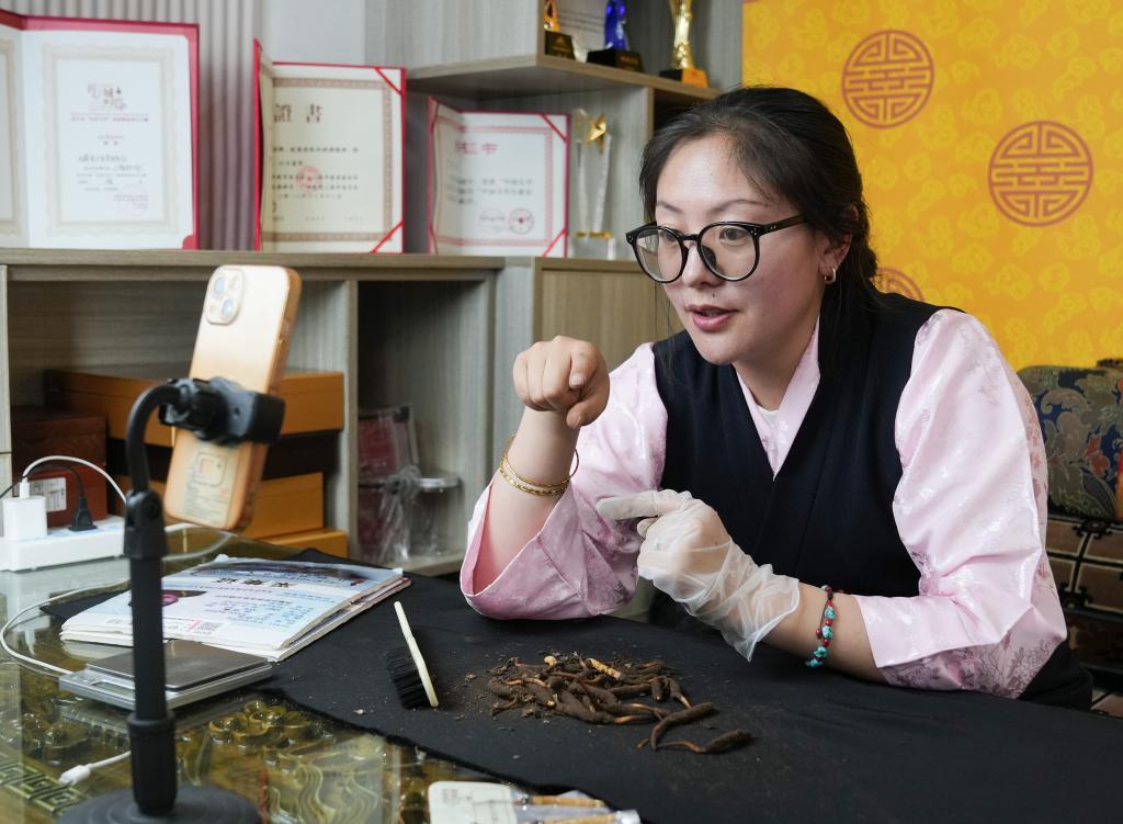 在夢(mèng)譽(yù)蟲(chóng)草產(chǎn)業(yè)帶直播基地,羅拉的妻子次仁白吉在直播帶貨(5月31日攝)。新華社記者丁汀 攝