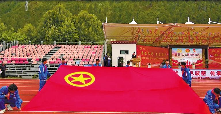 黨團(tuán)隊(duì)三旗傳承儀式現(xiàn)場(chǎng)。記者 胡文 通訊員 旦珍 攝