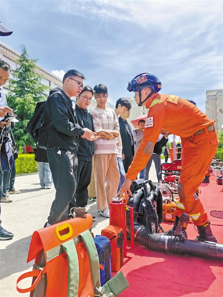 西藏大學(xué)學(xué)生聽取消防員講解消防救援設(shè)備的使用。通訊員 毛娜 攝
