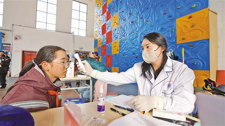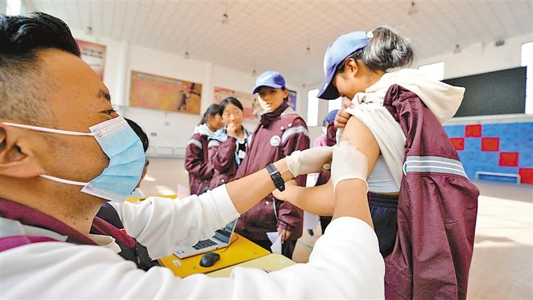 接種疫苗后,醫(yī)生在留觀區(qū)為學生測量體溫。記者 格桑倫珠 攝