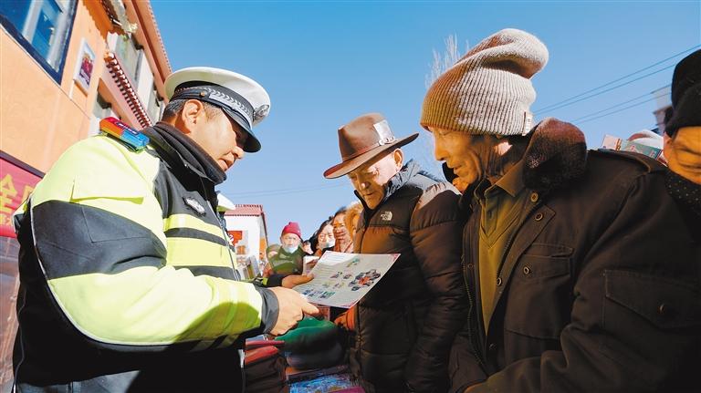 圖為民(輔)警向群眾講解交通安全知識。記者 格桑倫珠 通訊員 果珍 攝