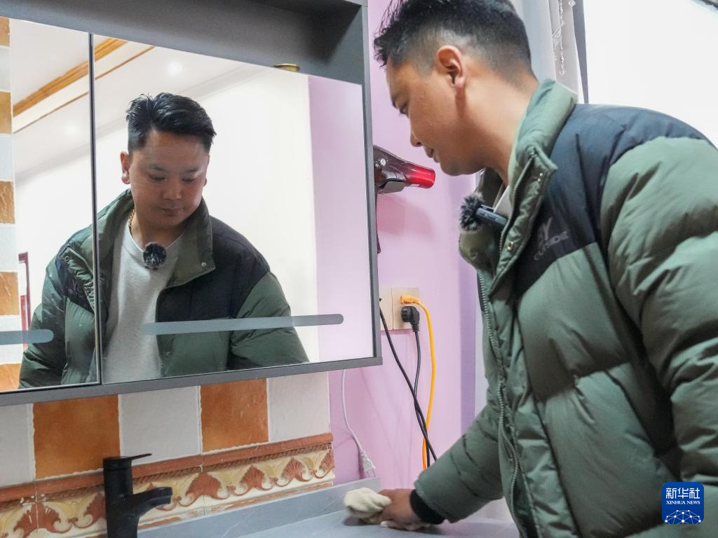 洛松頓珠在自家民宿內(nèi)整理房間(4月2日攝)。新華社記者 丁汀 攝