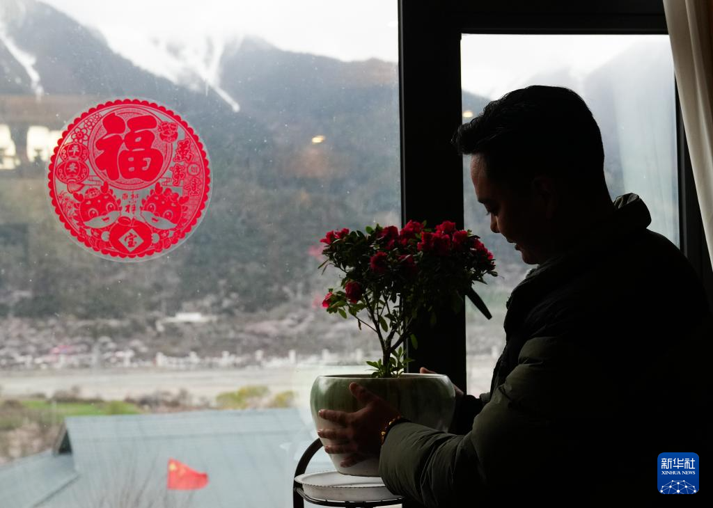 洛松頓珠在自家民宿的客廳整理盆栽(4月2日攝)。新華社記者 丁汀 攝