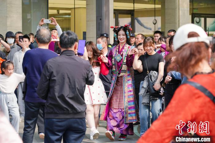此次文旅推廣活動中,主辦方在西子湖畔舉辦了一場藏裝時裝秀,十多位拉薩市當雄縣藝術團的演職人員身著各式藏裝獻上文藝表演、時裝走秀,吸引廣大游客駐足參與互動。