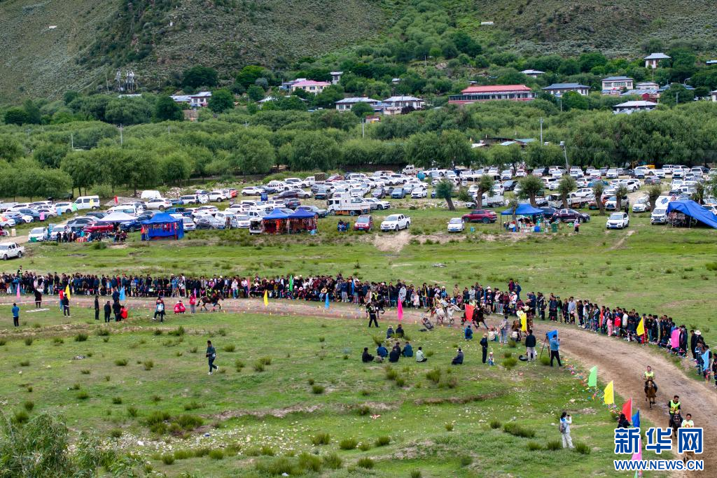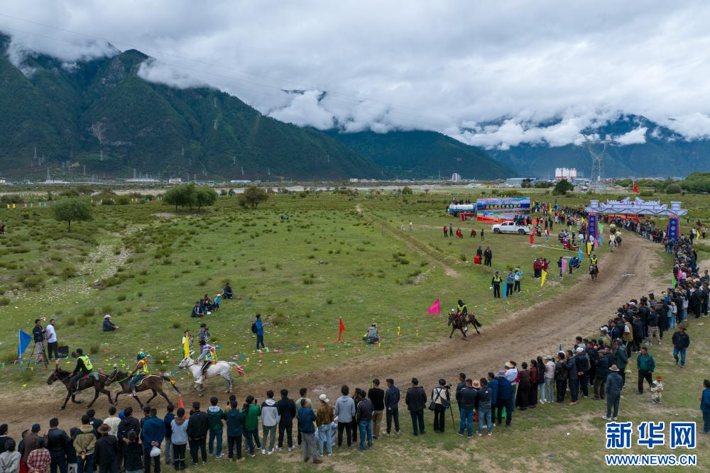 西藏林芝市林芝鎮(zhèn)第七屆尼洋旅游文化之民俗賽馬藝術(shù)節(jié)活動(dòng)現(xiàn)場(chǎng)(7月22日攝,無人機(jī)照片)。新華網(wǎng) 旦增努布 攝