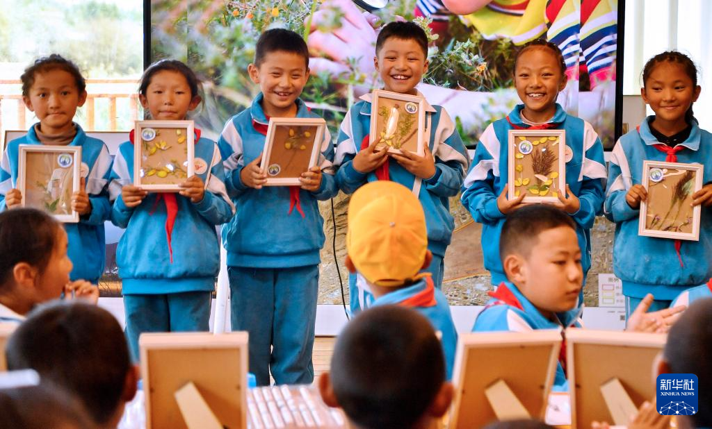 8月15日,拉魯小學(xué)的學(xué)生在拉魯濕地國家級自然保護區(qū)管理局科普小教室里向大家展示優(yōu)秀植物標本。新華社記者 張汝鋒 攝