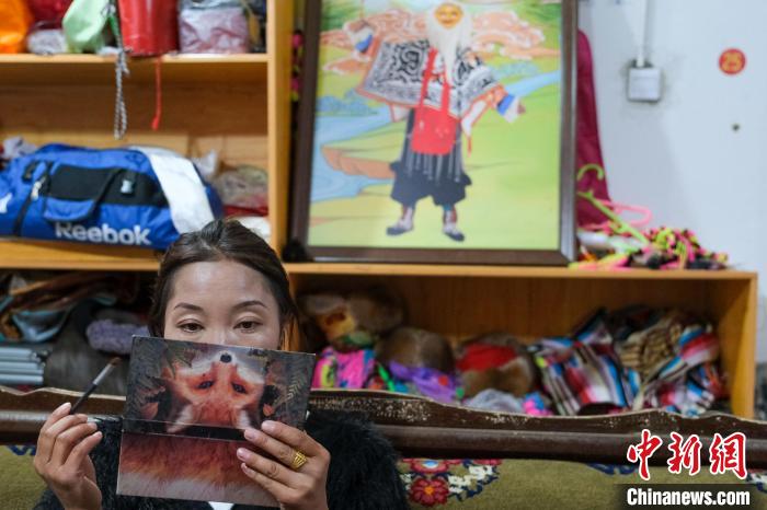 9月7日晚,西藏山南扎西曲登社區(qū)農(nóng)牧民白瑪央宗化妝準(zhǔn)備登臺(tái)表演傳統(tǒng)藏戲,山南鍋莊等。其身后是一幅藏戲畫。中新社記者 江飛波 攝