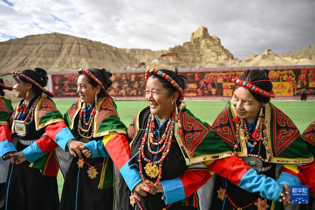 在西藏阿里地區(qū)札達(dá)縣古格王國(guó)遺址腳下,自治區(qū)級(jí)“宣舞”非遺傳承人央金(右)介紹“宣舞”(9月11日攝)。新華社記者 孫瑞博 攝 ??