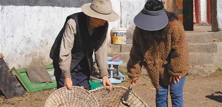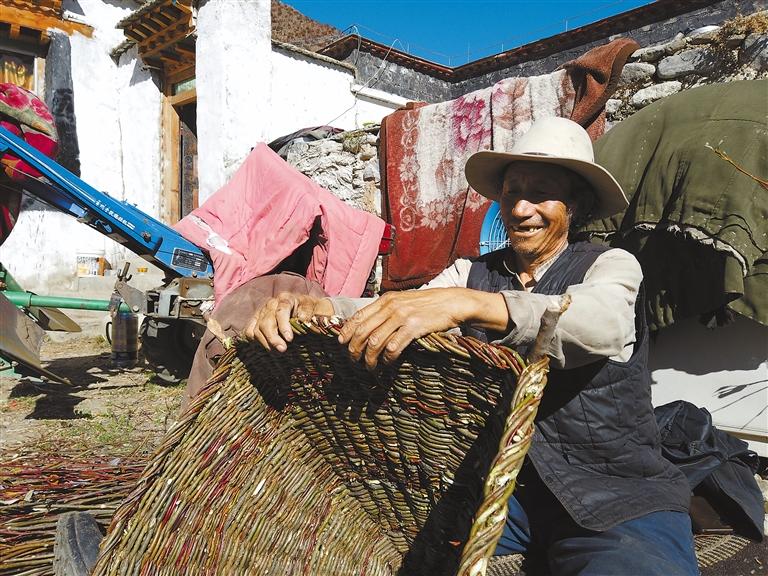 在墨竹工卡縣扎雪鄉(xiāng)格老窩村,記者走進阿若家的小院。院內,堆積的柳條旁是忙碌的阿若,他的手指在柳條間穿梭,一個個柳條筐子逐漸成形。