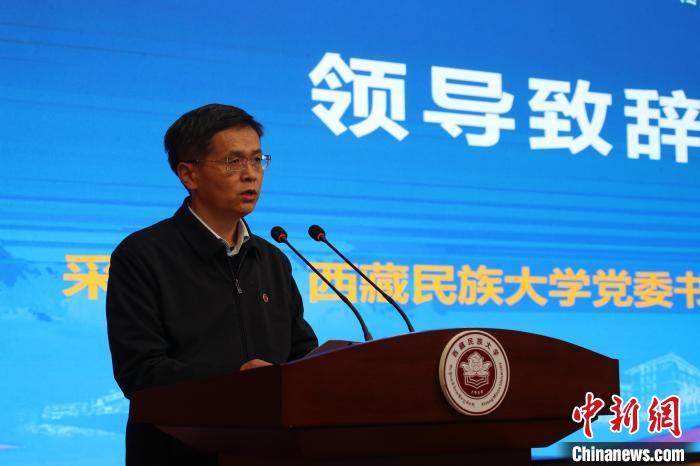 西藏民族大學(xué)黨委書(shū)記、副校長(zhǎng)采守寬在第四屆“藏秦·喜馬拉雅”論壇開(kāi)幕式發(fā)表致辭?!≈鬓k方供圖